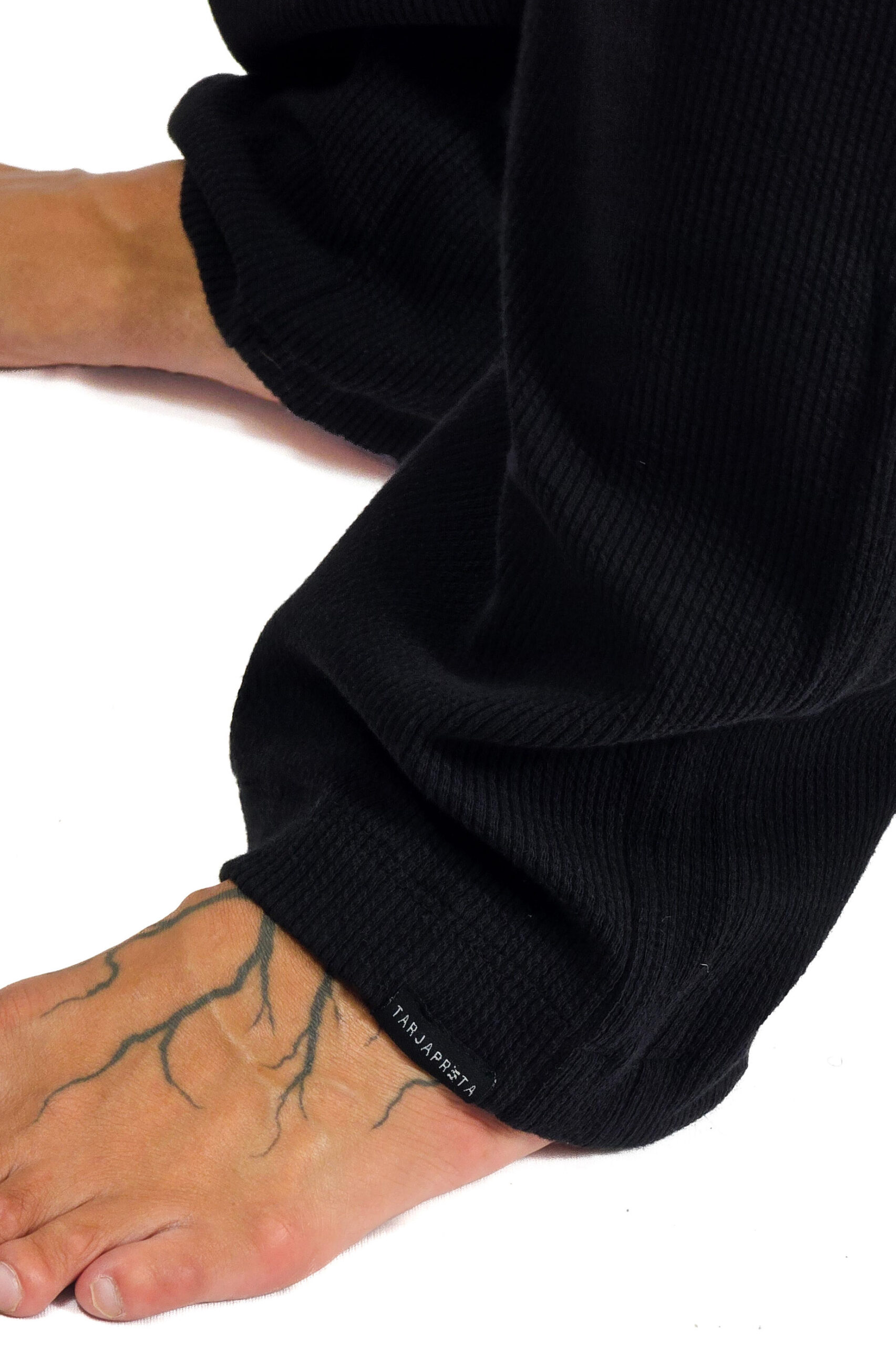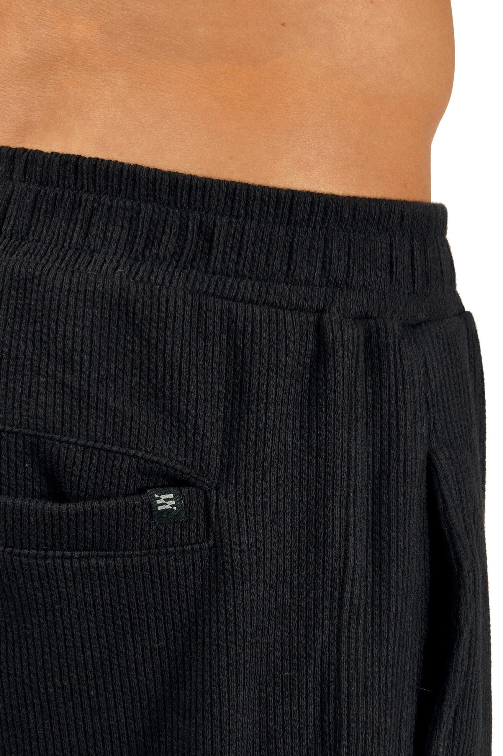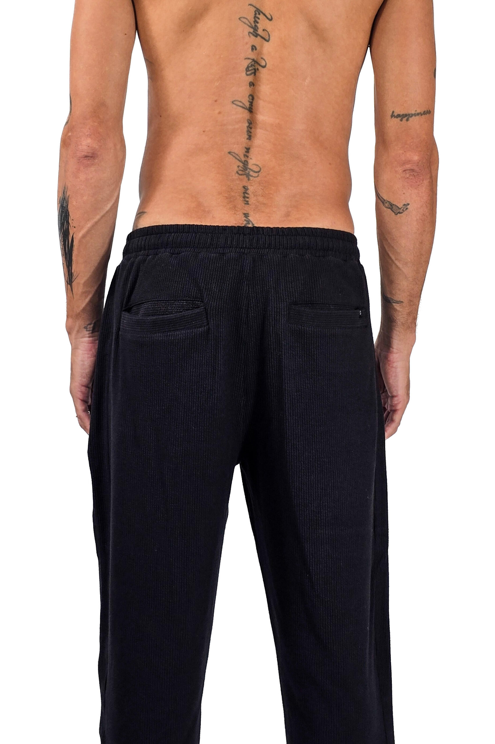 Feita em malha canelada de viscose, algodão e elastano, ela traz aquele relevo vertical que cria textura no preto e desenha o corpo sem grudar. O toque é macio e o caimento fluido.