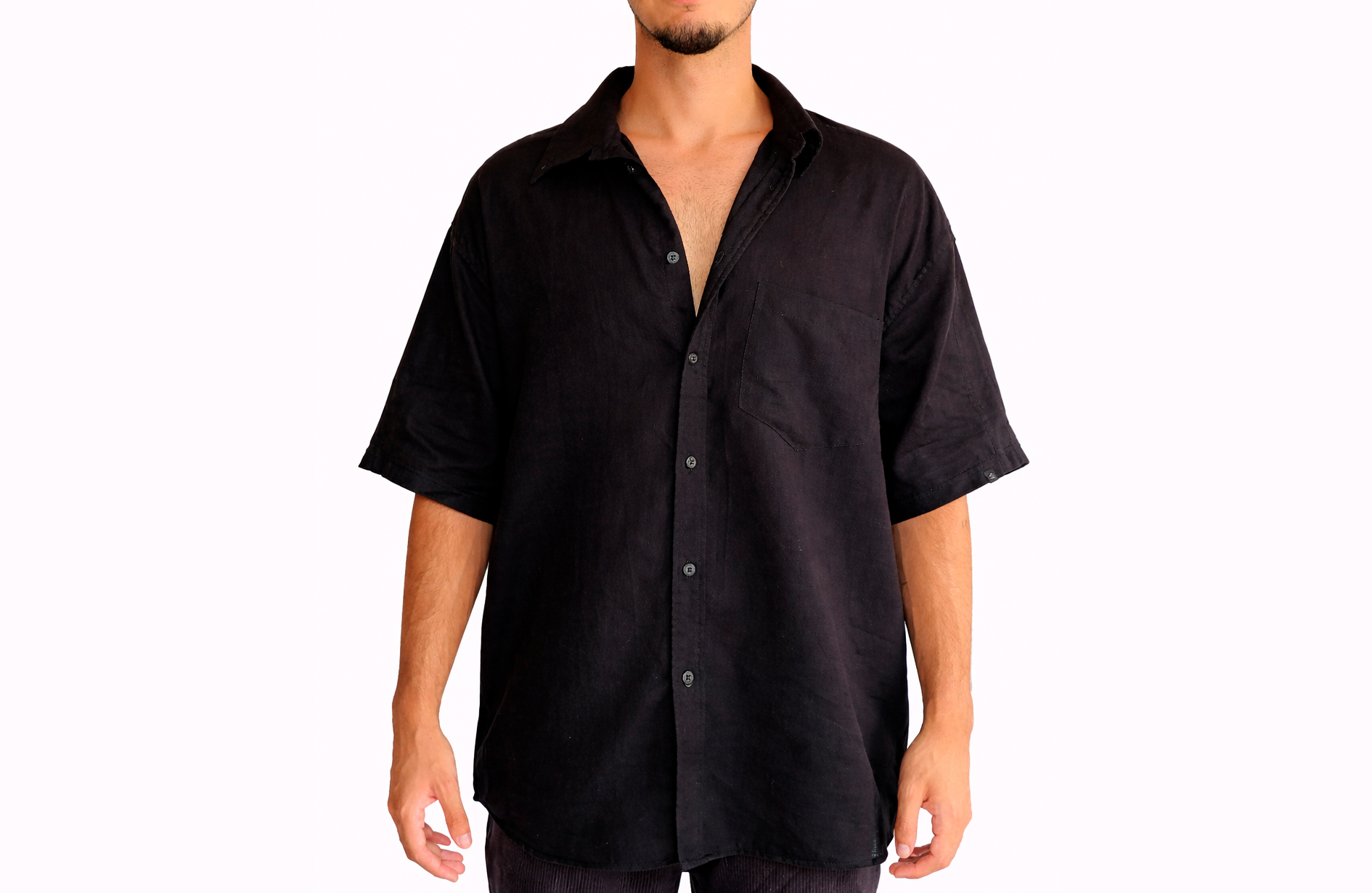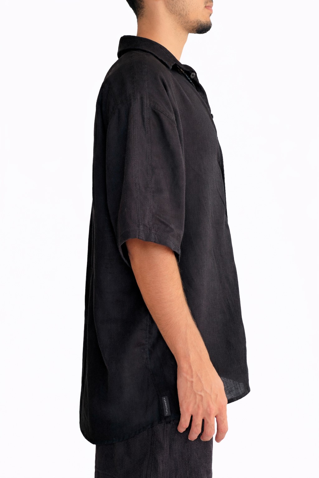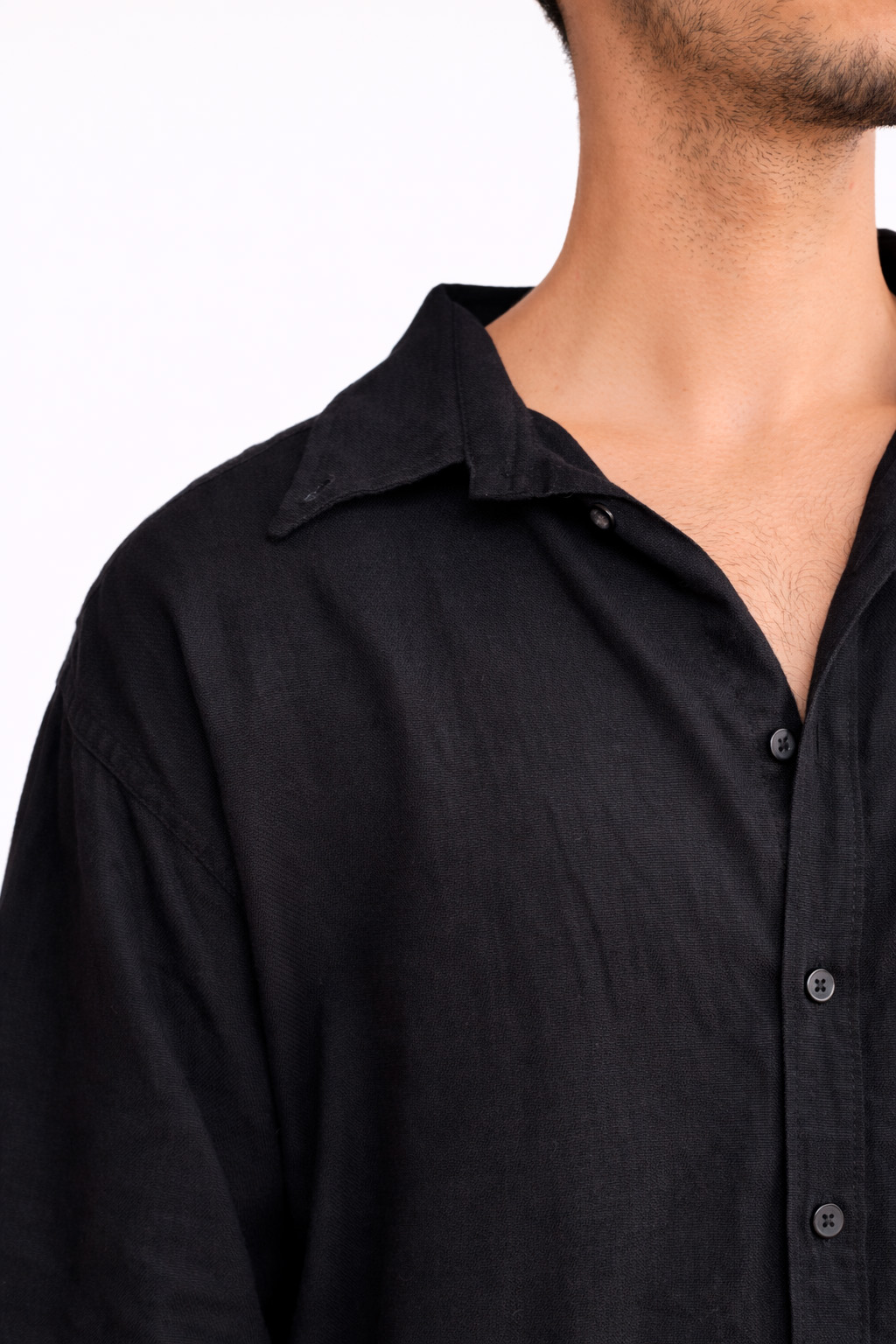 Mais do que uma camisa, é uma peça de presença silenciosa: o preto revela textura, forma e atitude.