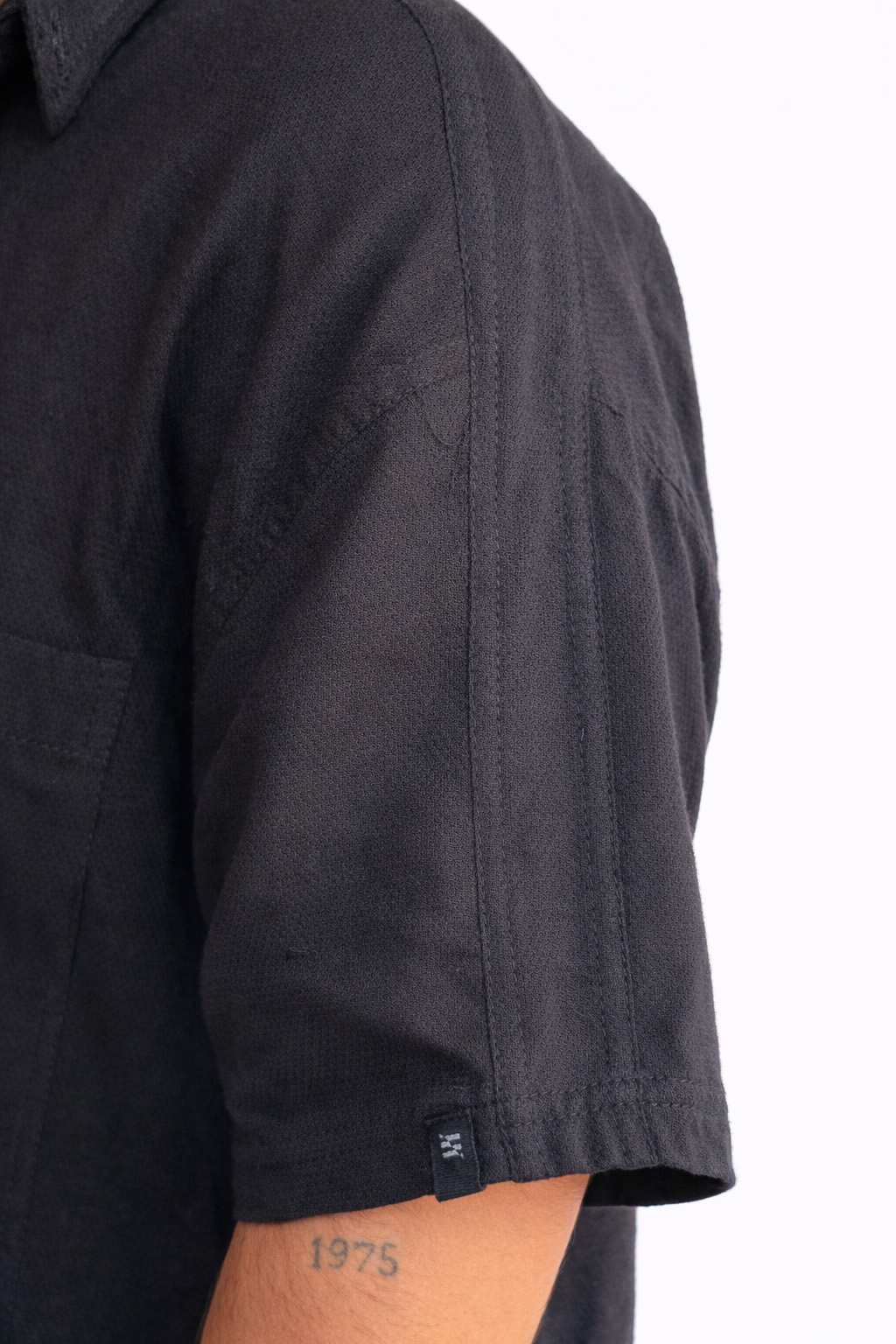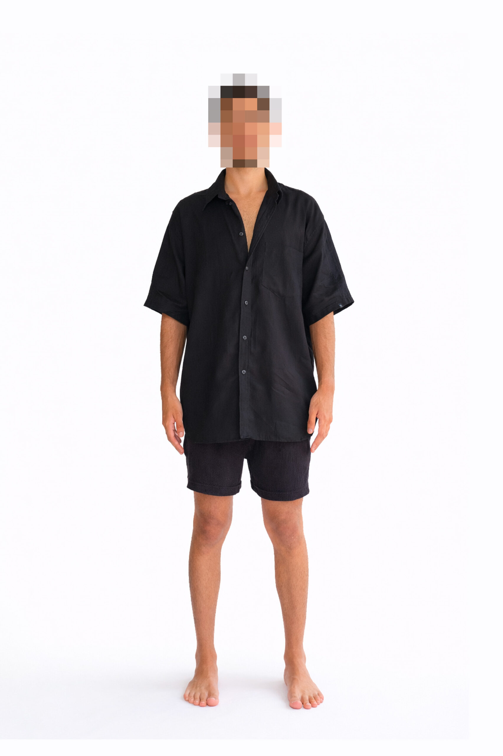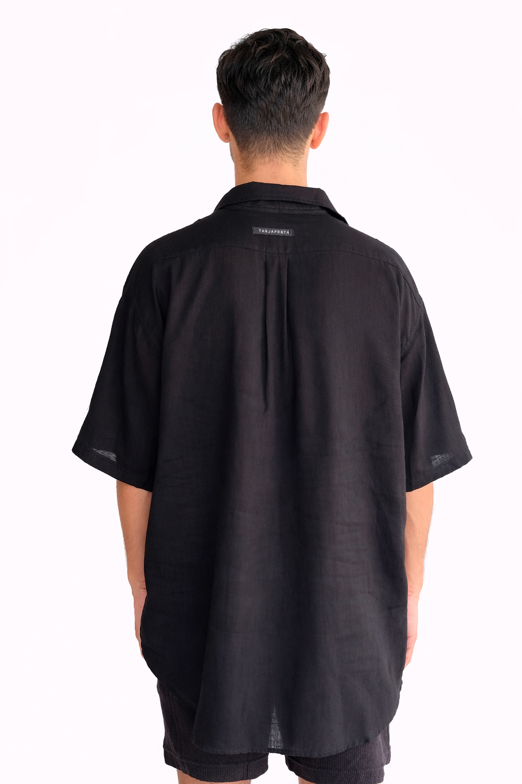 Mais do que uma camisa, é uma peça de presença silenciosa: o preto revela textura, forma e atitude.