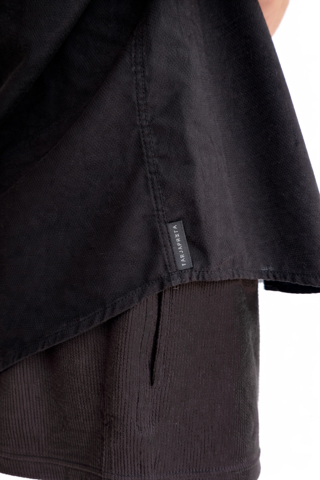 O tecido possui certificação OEKO-TEX (livre de substâncias nocivas à saúde humana) e foi escolhido pela textura maquinetada/rústica e pelo caimento leve, permitindo uso em diferentes contextos: da cidade ao lazer, do casual ao sofisticado. A modelagem é ampla e possui o recorte TARJA nas mangas, decorado com pesponto preto (tom sobre tom) em toda a sua extensão.