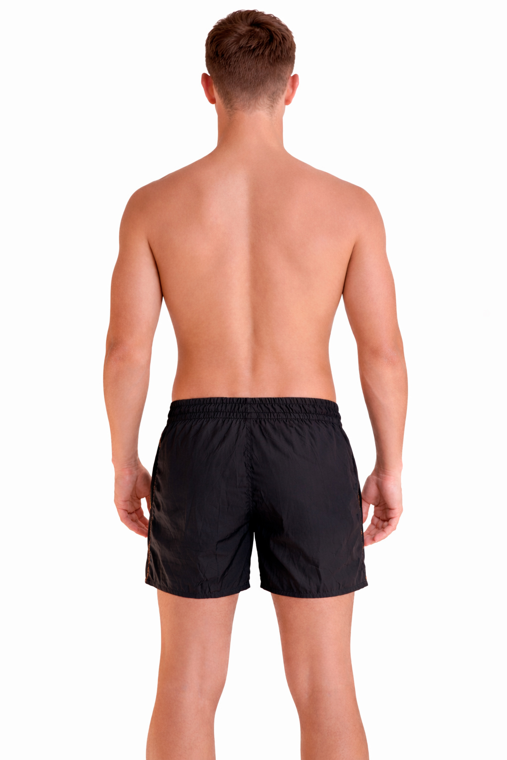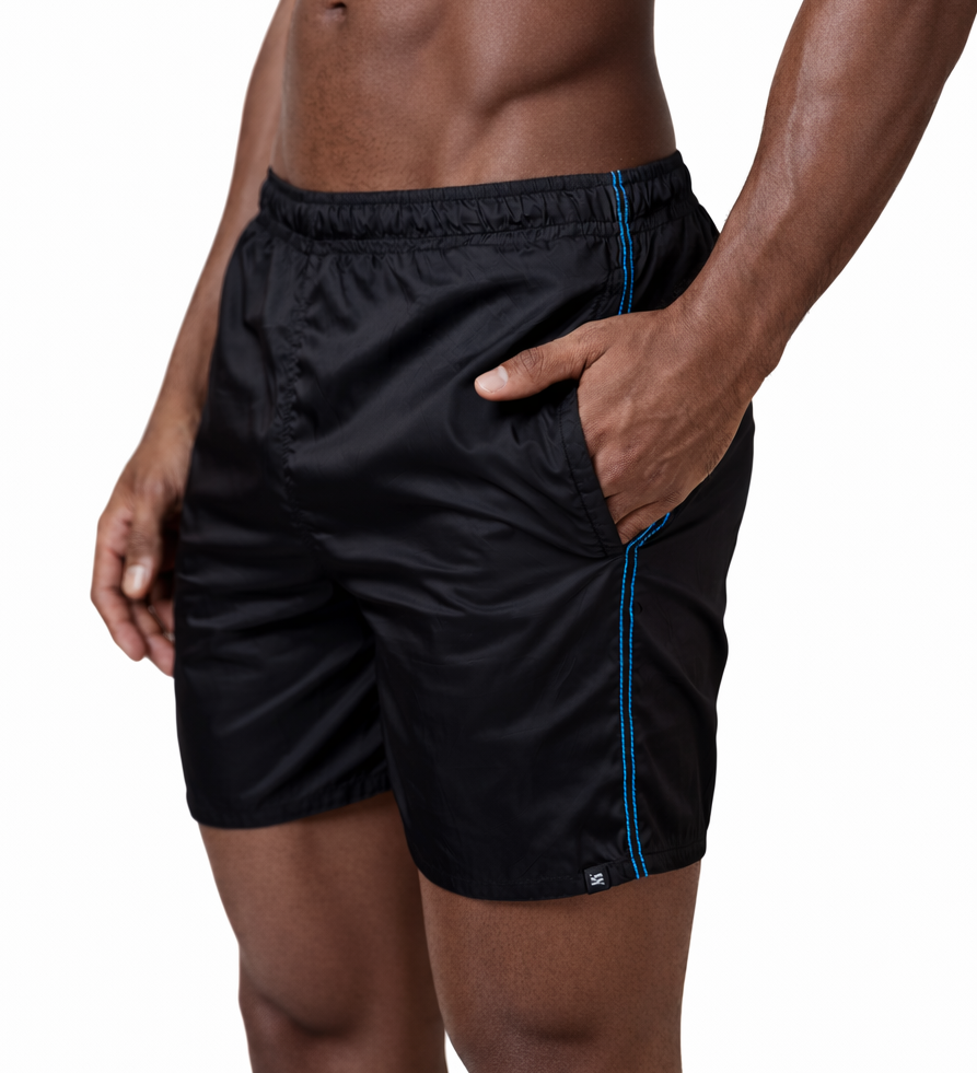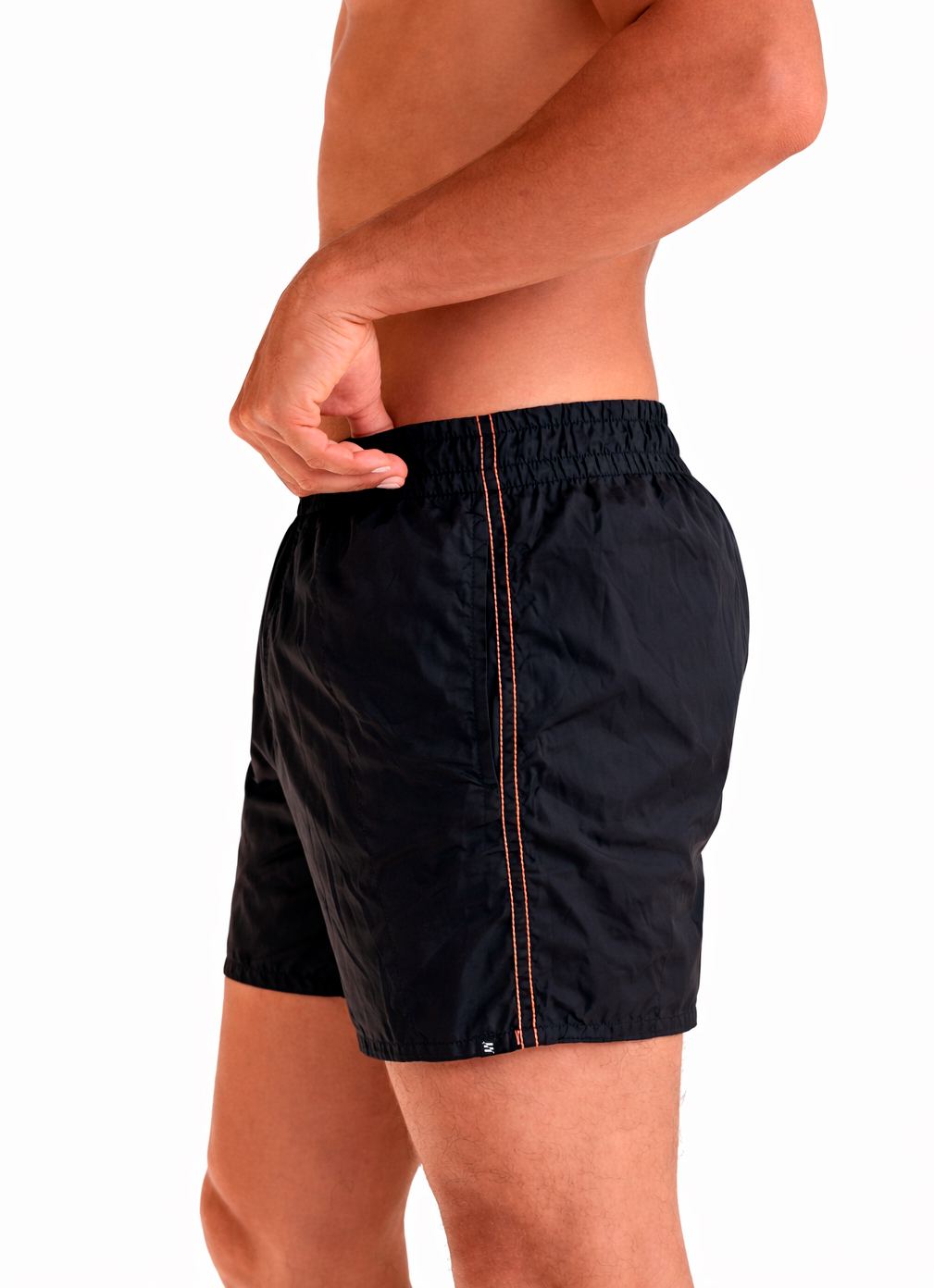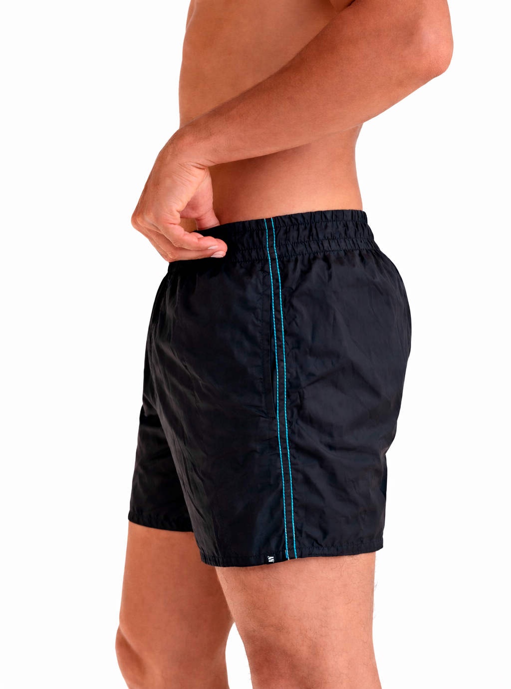 A modelagem é média (própria de shorts de banho) e curtinha, com elástico no cós, bolsos laterais e o pesponto TARJA contrastado na lateral. É o tipo de peça que você usa e esquece que está usando.