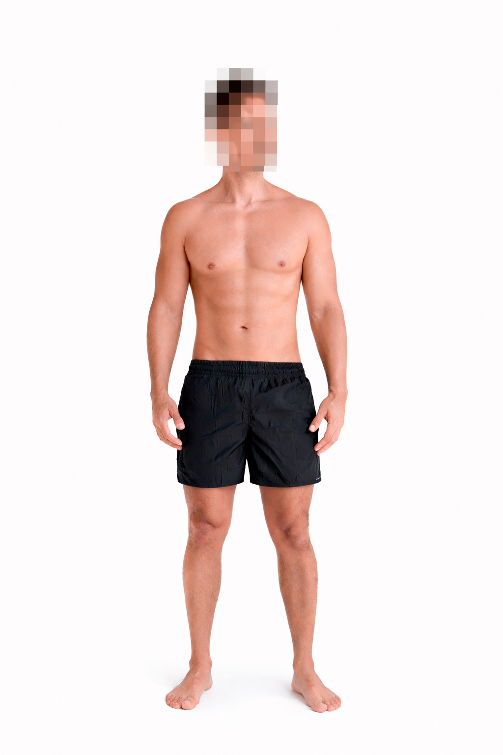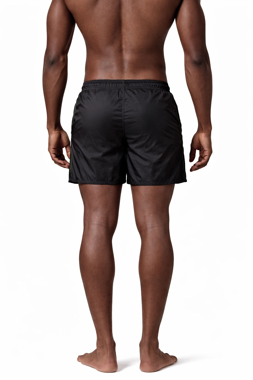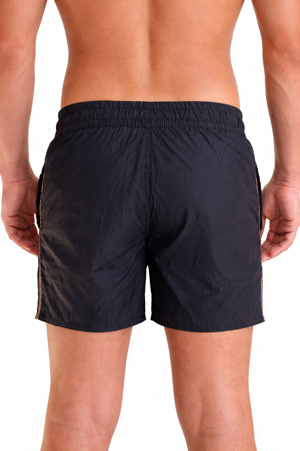 A modelagem é média (própria de shorts de banho) e curtinha, com elástico no cós, bolsos laterais e o pesponto TARJA contrastado na lateral. É o tipo de peça que você usa e esquece que está usando.