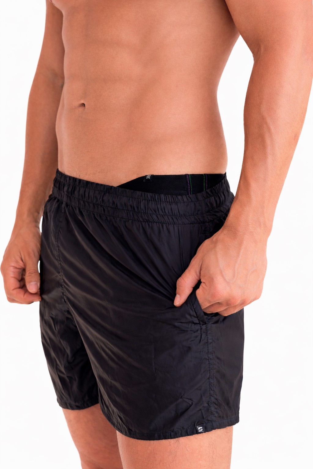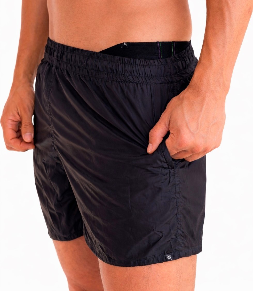 O SHORT ZERO é a peça mais leve, funcional e técnica da coleção — puro movimento e ar. Feito em poliamida ultraleve usada em corta ventos, com acabamento levemente repelente à água, seca rápido, não pesa, não prende o corpo e fica sempre pronto para a próxima rodada: praia, treino, rua, banho frio, o que você quiser. O toque é geladinho, amassadinho, tecnológico.