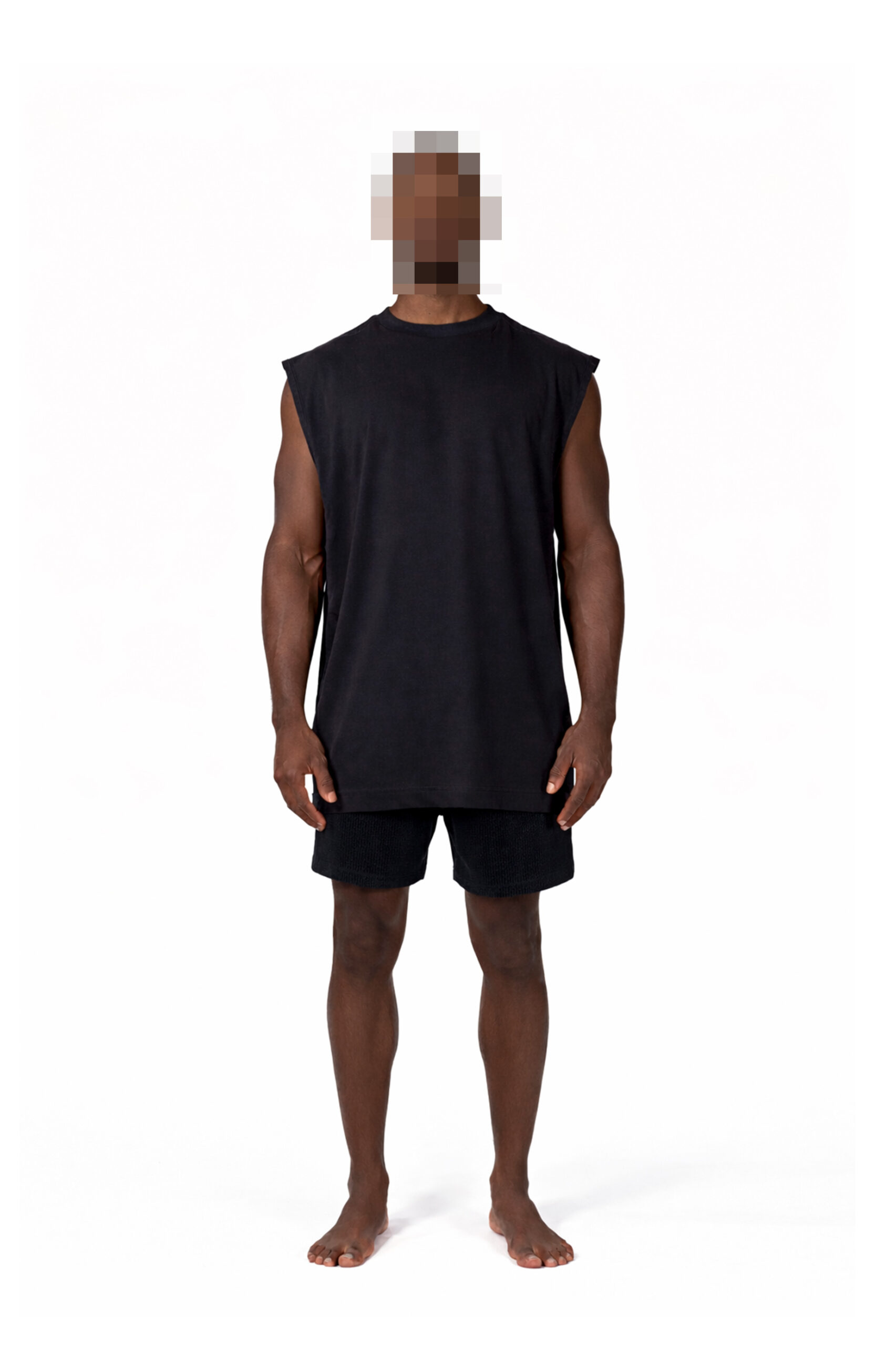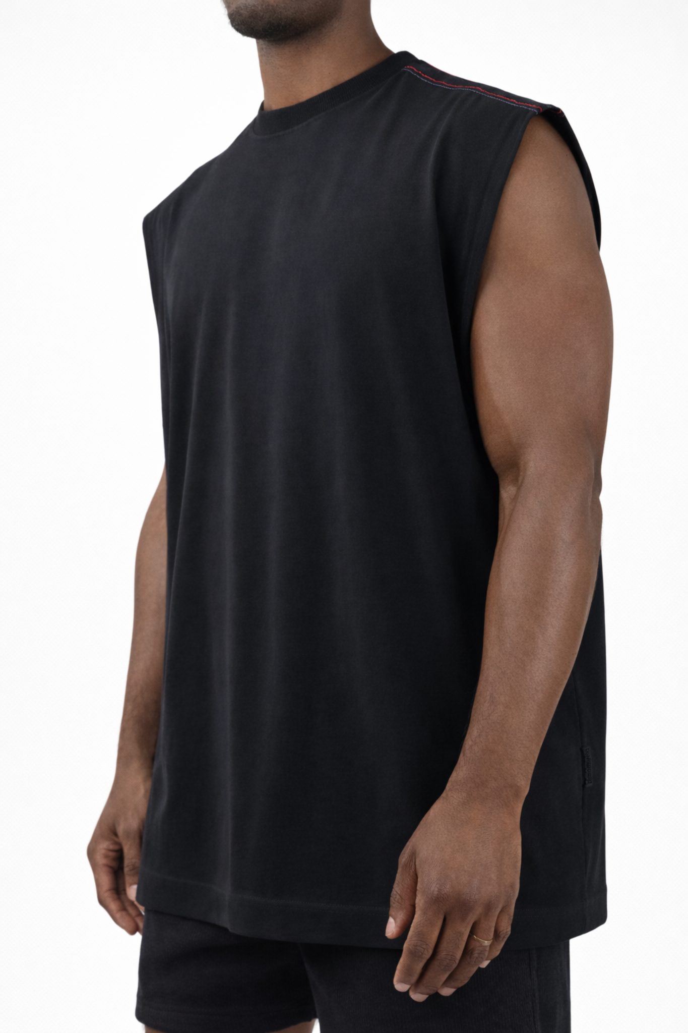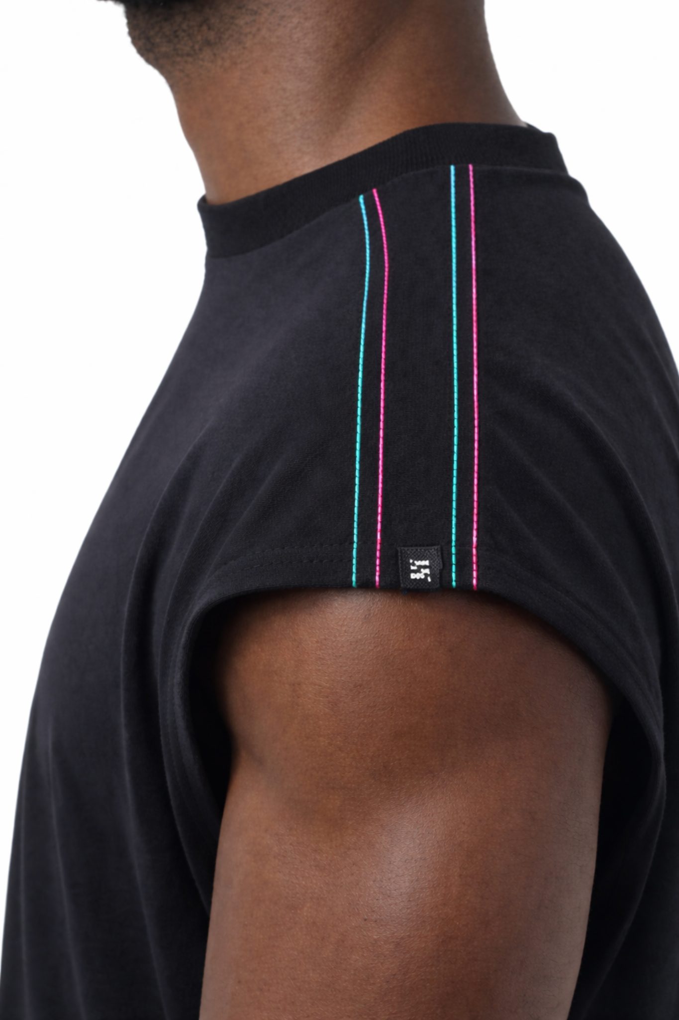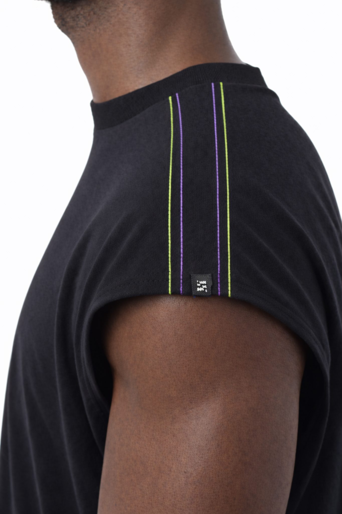 Aqui, o modelo ganha identidade própria: o recorte TARJA aplicado sobre o ombro, rebatido com pesponto duplo em contraste, funciona como um traço urbano correndo pela peça. A modelagem é ampla, de ombro marcado e cava profunda — uma mistura de treino, rua e design contemporâneo. A gola de ribana rebatida segura a estrutura e a barra com costura dupla finaliza com precisão.